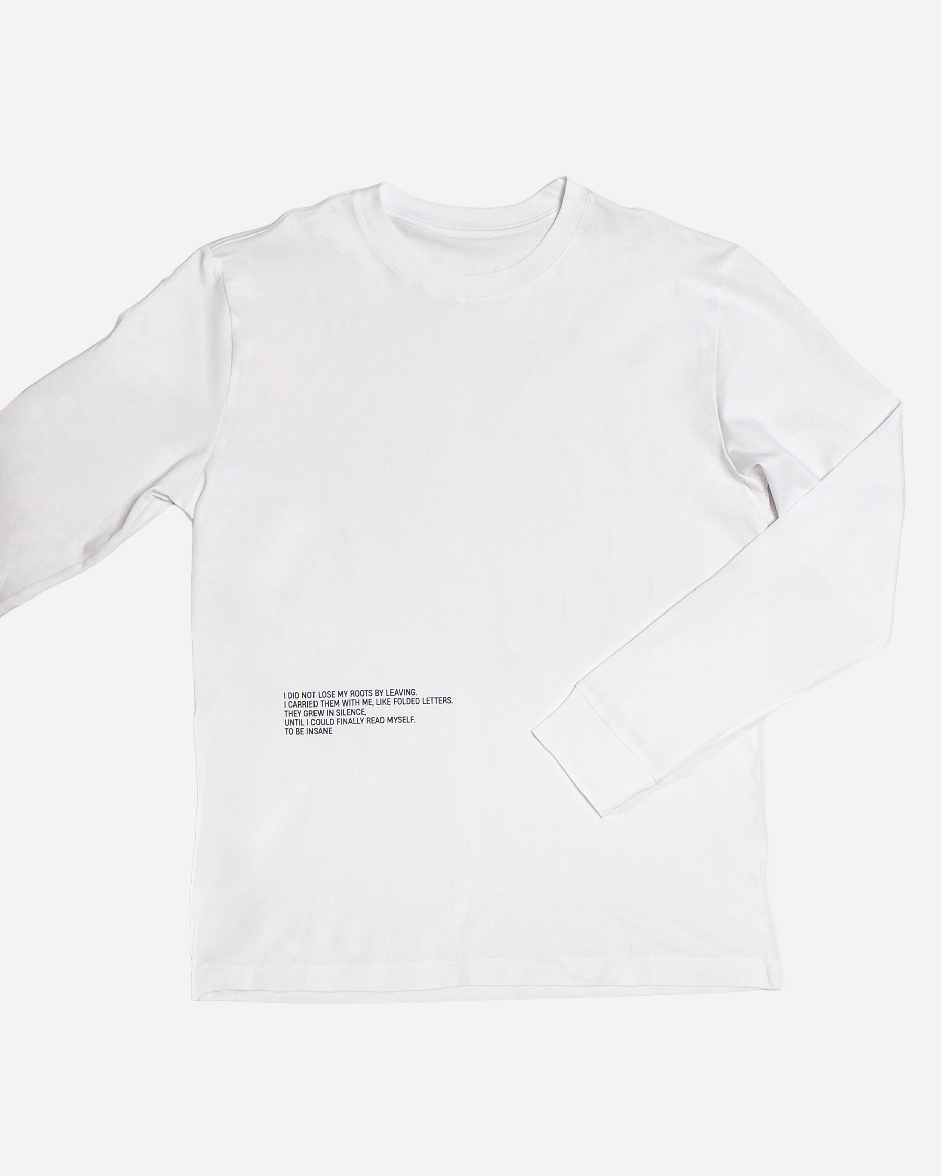 Cleanes weißes Longsleeve mit „ROOTS“-Poem auf der Seite – für alle, die ihre Wurzeln mitnehmen, egal wohin sie gehen.