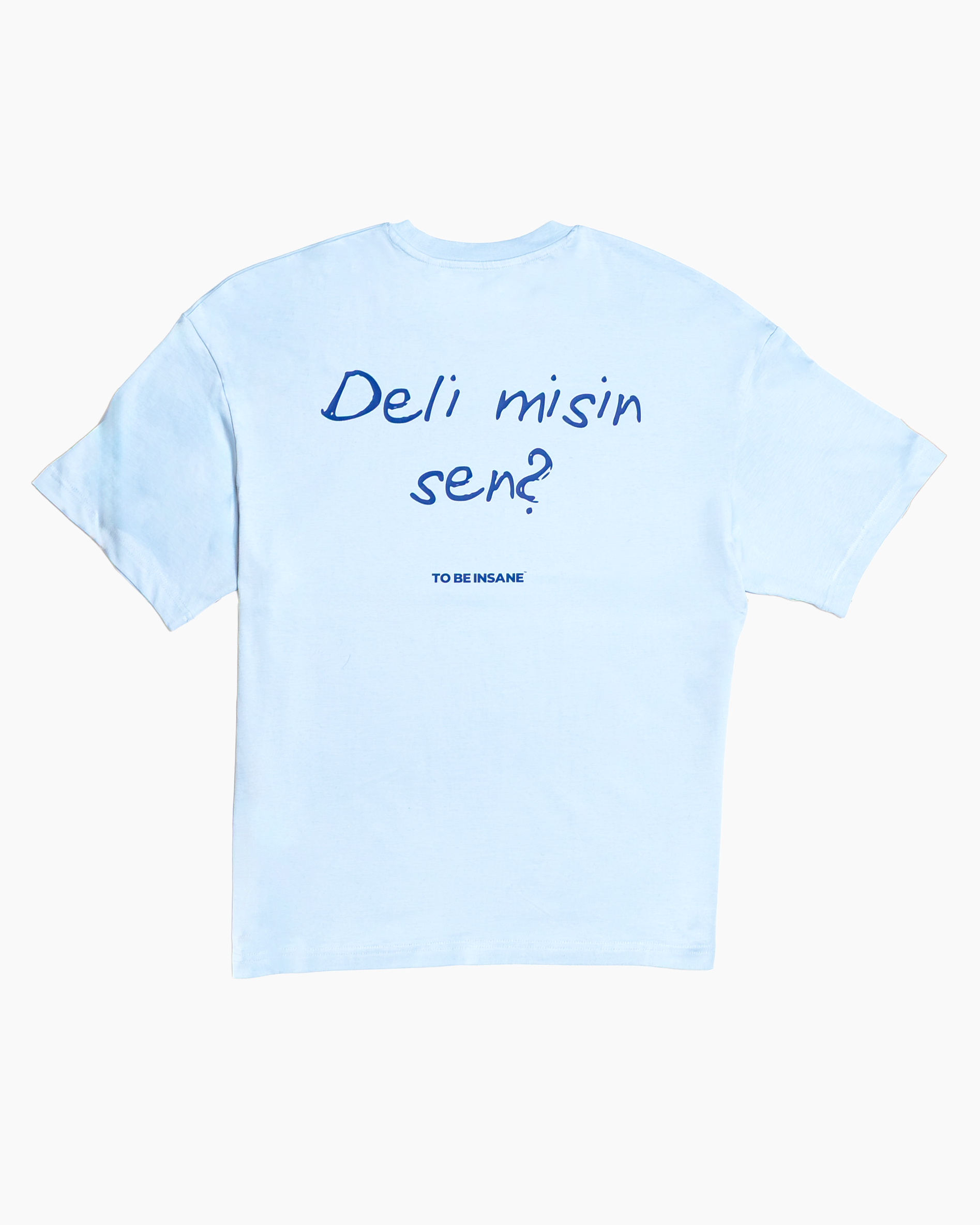 Hellblaues Oversized T-Shirt mit türkischem Backprint „Deli misin sen?“ – die Frage aller Fragen: Bist du verrückt?